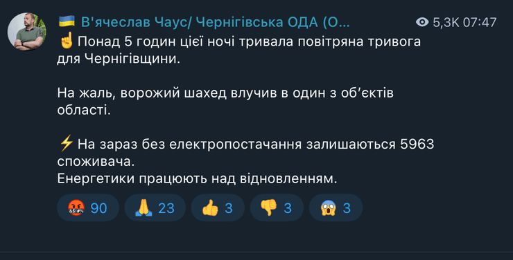 По словам главы Черниговской ОГА Вячеслава Чауса, воздушная тревога в регионе продолжалась более пяти часов.