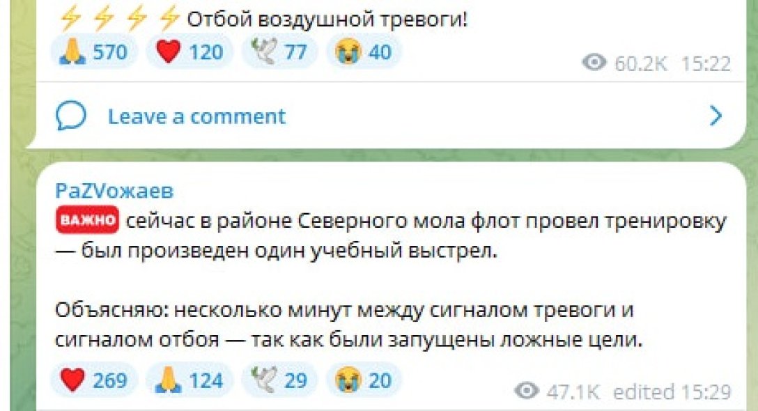 "Сейчас в районе Северного мола флот провел тренировку — был сделан один учебный выстрел. Объясняю: несколько минут между сигналом тревоги и сигналом отбоя — поскольку были запущены ложные цели", — пояснил он.