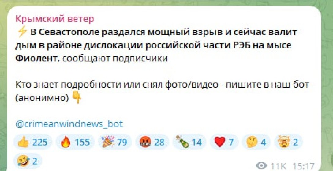 "В Севастополе прогремел мощный взрыв, и сейчас валит дым в районе дислокации российской части РЭБ на мысе Фиолент", — говорится в сообщении.