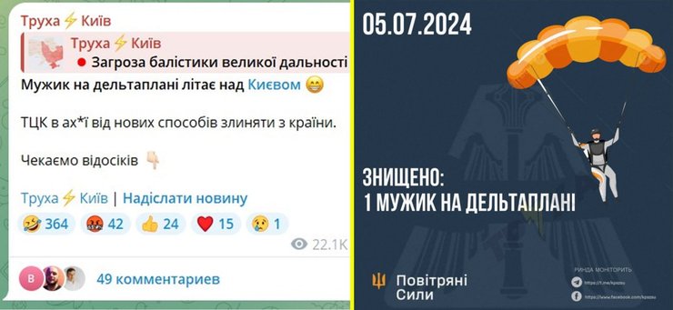 "Мужик на дельтаплане летает над Киевом. ТЦК в ах*е от новых способов слинять из страны", — говорится в сообщении.