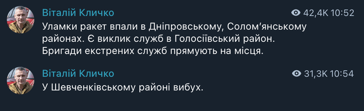 Позже Кличко сообщил, что обломки ракет упали в Днепровском, Соломенском районах.