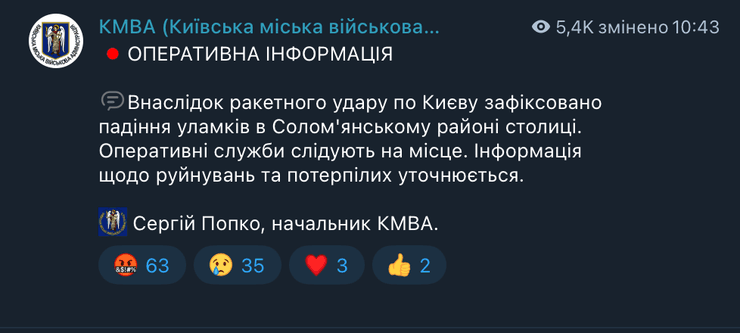 Падение обломков вражеской ракеты зафиксировано в Соломенском районе. Воздушная тревога продолжает продолжаться в столице.