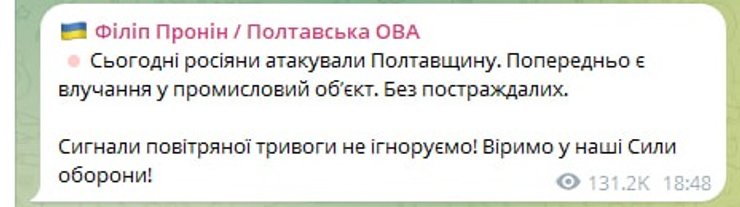 "Сегодня россияне атаковали Полтавскую область. Предварительно есть попадание в промышленный объект. Без пострадавших", — проинформировал Пронин.