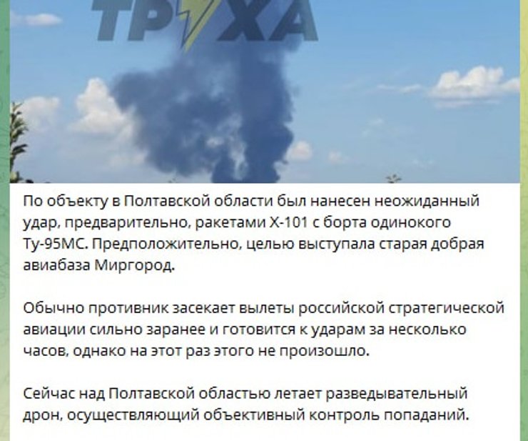 "По объекту в Полтавской области был нанесен неожиданный удар, предварительно, ракетами Х-101 с борта одинокого Ту-95МС. Предположительно, целью выступала старая добрая авиабаза Миргород. Обычно противник засекает вылеты российской стратегической авиации очень заранее и готовится к ударам за несколько часов, однако на этот раз этого не произошло", — говорится в сообщении.