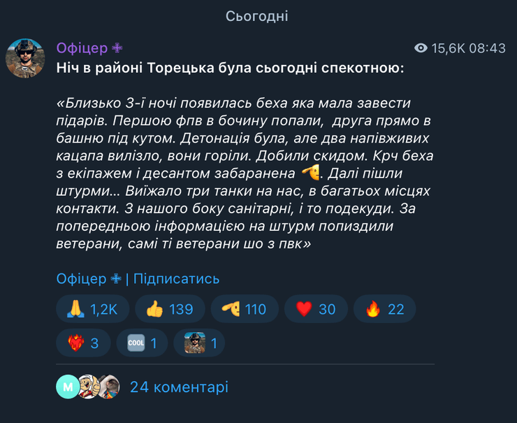 "Крч беха с экипажем и десантом захвачена. Дальше пошли штурмы... Выехало три танка на нас, во многих местах контакты. С нашей стороны санитарные, и то кое-где", — рассказал офицер ВСУ.