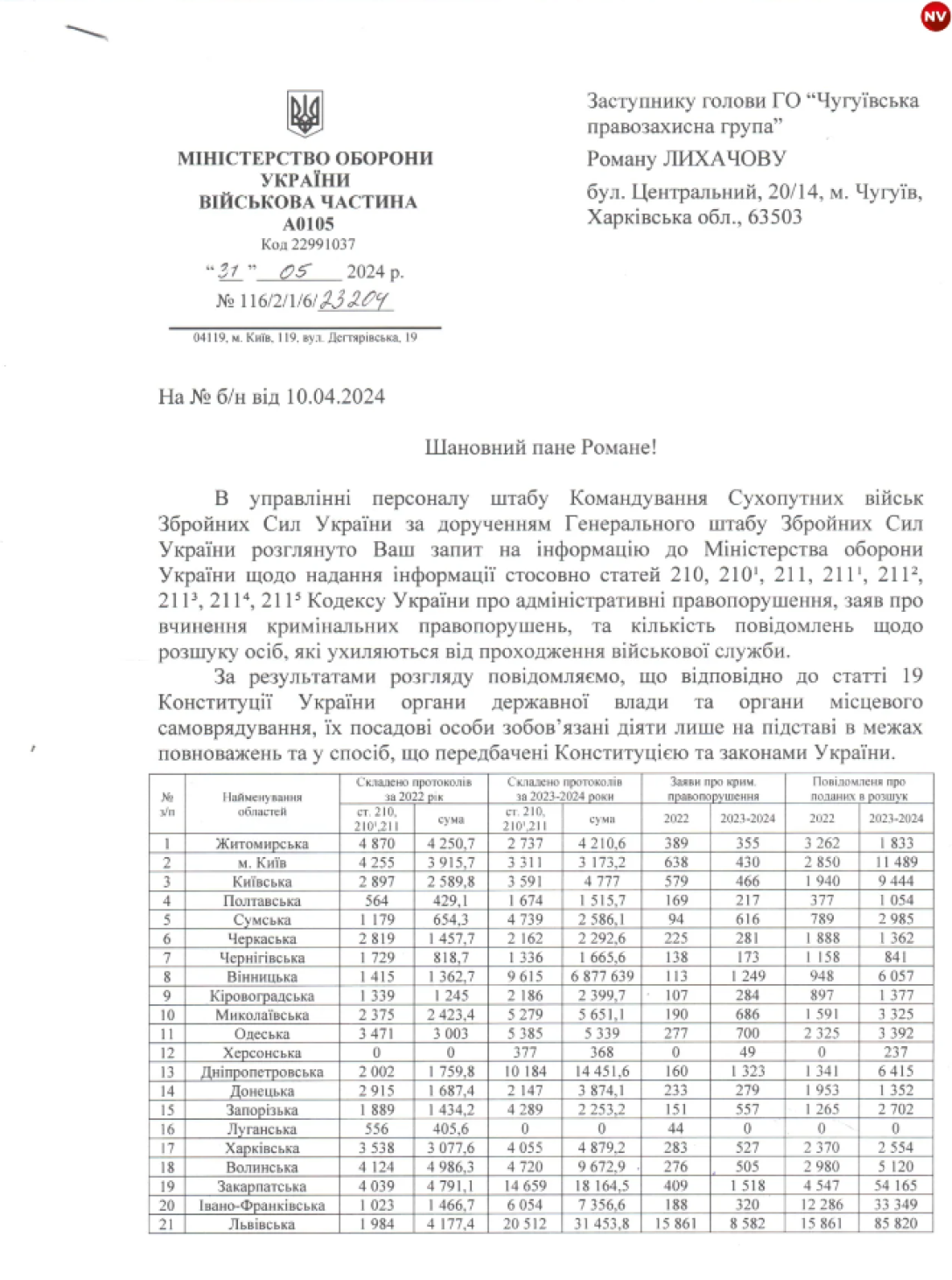 Также из этого документа следует, что с начала полномасштабного вторжения ТЦК составили более 180 тысяч административных протоколов на нарушителей воинского учета и подали 400 тысяч сообщений о розыске граждан, уклоняющихся от призыва. Только в 2023 и первой половине 2024 года ТЦК подали 316 тысяч сообщений, касающихся розыска уклонистов. В лидерах западные регионы страны.