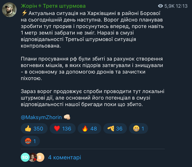 "Актуальная ситуация на Харьковщине в районе Боровой на сегодняшний день следующая. Враг действительно планировал сделать здесь прорыв и продвинуться вперед, однако даже 1 метр земли забрать не смог", — сказал Максим Жорин.