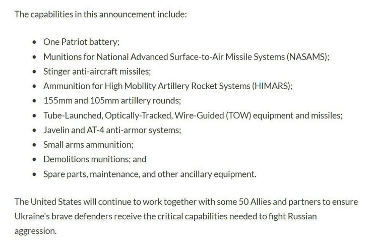 В список военной помощи вошла батарея ПВО Patriot, боеприпасы для систем NASAMS и HIMARS, артиллерийские снаряды, противотанковое оружие, боеприпасы для стрелкового оружия и другое оборудование.