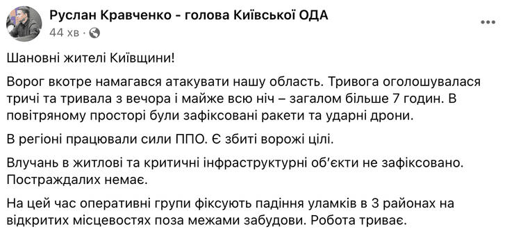 "Враг в очередной раз пытался атаковать нашу область. Тревога объявлялась трижды и продолжалась с вечера и почти всю ночь — всего более 7 часов. В воздушном пространстве были зафиксированы ракеты и ударные дроны", — сказал Руслан Кравченко.