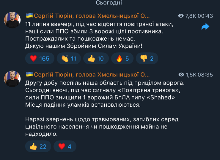 Председатель Хмельницкой ОГА Сергей Тюрин сообщил, что вечером 11 июля ПВО уничтожила три российские цели в регионе, пострадавших и повреждений нет.