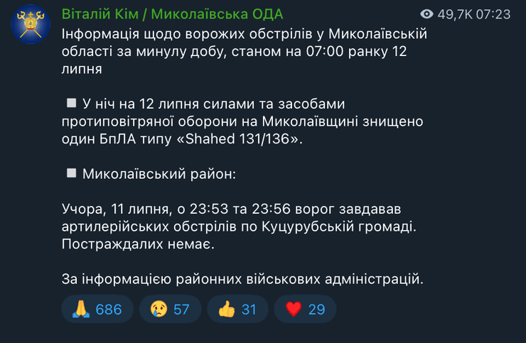 "В ночь на 12 июля силами и средствами противовоздушной обороны на Николаевщине уничтожен один БпЛА типа Shahed 131/136", — сказал Ким.