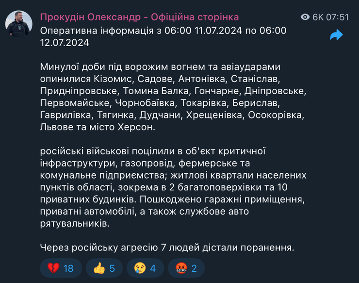 По словам Александра Прокудина, председателя Херсонской ОГА, в течение 11 июля под вражеским огнем и авиаударами оказались ряд населенных пунктов, а именно Кизомыс, Садовое, Антоновка, Станислав, Приднепровское, Томина Балка, Гончарное, Днепровское, Первомайское, Чернобаевка, Токаревка, Берислав, Гавриловка, Тягинка, Дудчаны, Крещеновка, Осокоровка, Львовое и Херсон.