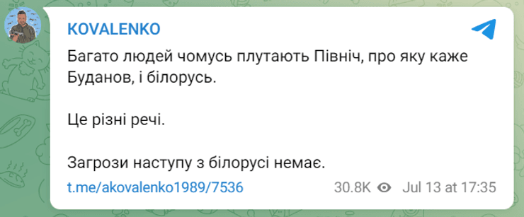 "Многие люди почему-то путают Север, о котором говорит Буданов, и Беларусь. Это разные вещи. Угрозы наступления из Беларуси нет", — заверил Коваленко.