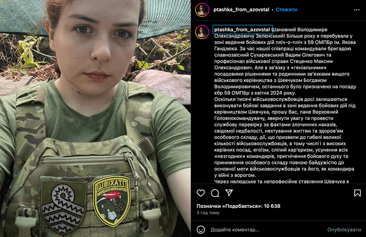 Она отметила, что более года находилась в зоне боевых действий бок о бок с 59-й ОМПБр им. Якова Гандзюка, которой командовали Вадим Сухаревский и Максим Стеценко. Однако, по ее словам, из-за "гениальных" должностных решений и родственных связей высшего военного руководства с Богданом Шевчуком, в апреле 2024 года последнего назначили на должность командира бригады.