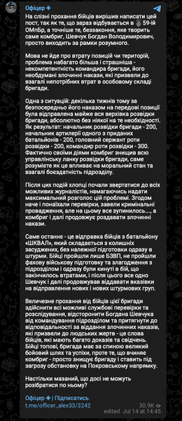 "Бойцы топовые, бригада имеет за спиной большой боевой путь и успехи, однако то, что совершает комбриг — просто уничтожает бригаду и ставит под угрозу обстановку на Покровском направлении. Настолько мазаный, что до сих пор не могут разобраться по нему?" — добавил он.