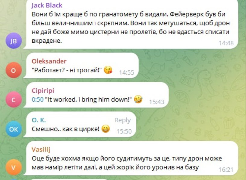 На обнародованных кадрах, снятых камерами наблюдений на нефтебазах видно, как охранники неуклюже пытаются сбивать украинские дроны. Видно, что они не умеют пользоваться этим оружием и стреляют из него куда попало и не попадают. Беспилотники выполняют свою миссию до конца.
