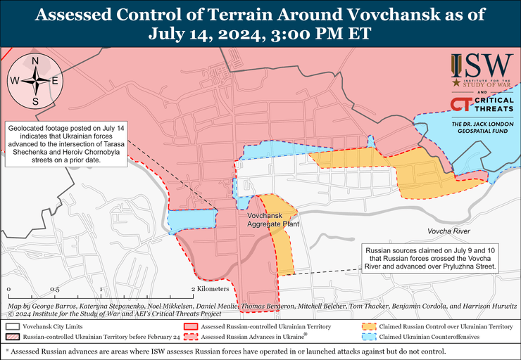 "Украинские силы провели локализованные контратаки к северу и северо-востоку от города Харькова и недавно восстановили ограниченные позиции в Волчанске", — говорится в сообщении.