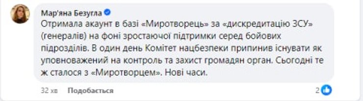 "Получила аккаунт в базе "Миротворец" за "дискредитацию ВСУ" (генералов) на фоне растущей поддержки среди боевых подразделений. В один день Комитет нацбезопасности прекратил существовать как уполномоченный на контроль и защиту граждан орган. Сегодня то же произошло с "Миротворцем". Новые времена", — написала она