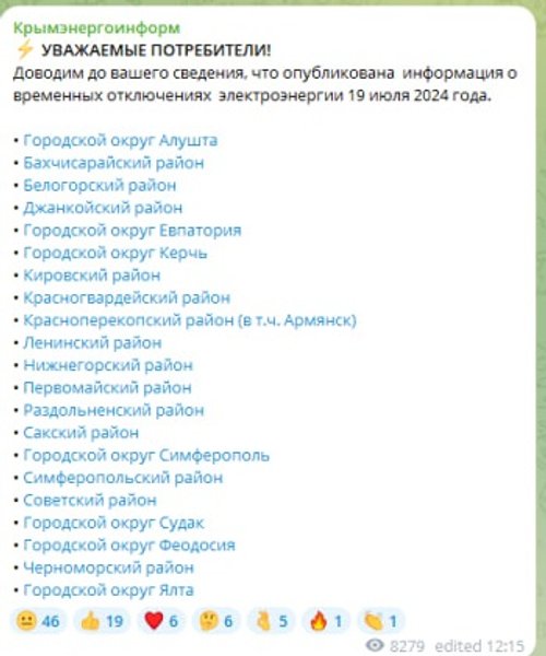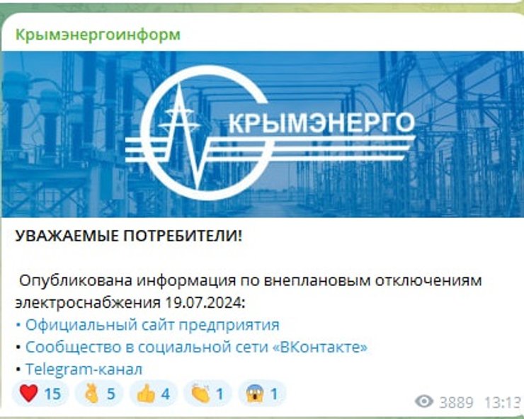 "В связи с аномальной жарой и повышением нагрузок на энергосистему Юга России, а также для сохранения устойчивости энергетической инфраструктуры Республики Крым, 19 июля 2024 года введен график временного ограничения потребления электроэнергии на полуострове", — говорится в сообщении.