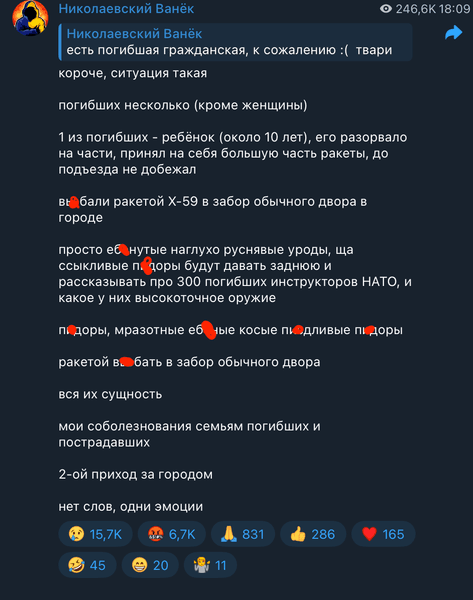 В анонимном Telegram-канале "Николаевский Ванек" отметили, что погиб ребенок около десяти лет, его разорвало на части.