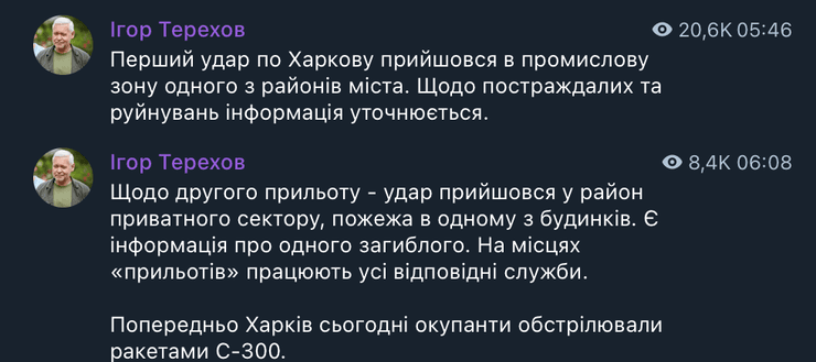 По его словам, предварительно, оккупанты обстреляли Харьков с помощью ракет типа С-300.
