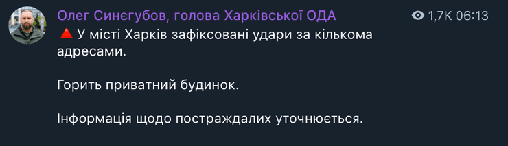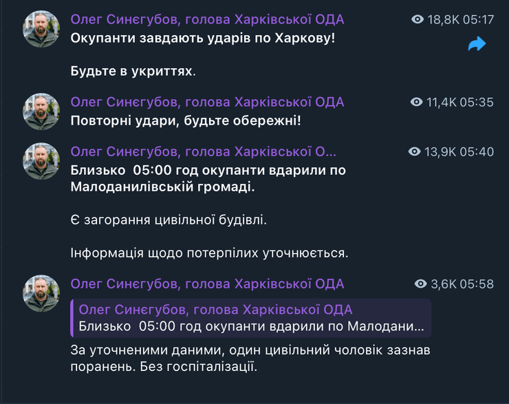 В 5:17 председатель Харьковской ОГА Олег Синегубов рассказал, что враг наносил удары по Харькову. Через несколько минут состоялся повторный обстрел.