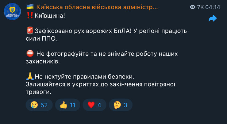 Около 4 утра в Киевской ОГА сообщили о движении российских дронов и предупредили о работе ПВО.