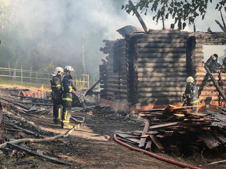 Как информируют в ГСЧС, после удара произошел пожар на территории здания конюшни, пламя перекинулось на деревянную хозяйственную постройку и гостевой дом. Общая площадь пожара составила около 1 500 кв.м.