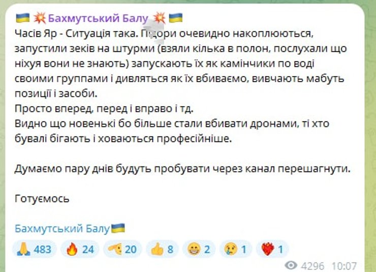 "Часов Яр — ситуация такая. П**оры, очевидно, накапливаются. Запустили зеков на штурмы (взяли несколько в плен, послушали что н**уя они не знают) запускают их, как камешки по воде своими группами и смотрят, как их убиваем, изучают видимо позиции и средства. Просто вперед, перед и вправо и тото", — рассказал "Балу".