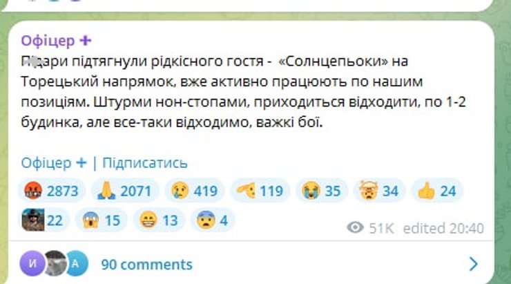 "П**ары подтянули редкого гостя — "Солнцепеки" на Торецкое направление, уже активно работают по нашим позициям. Штурмы нон-стопами, приходится отходить, по 1-2 дома, но все-таки отходим, тяжелые бои", — пишет "Алекс".