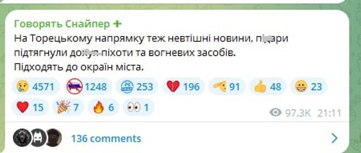 На Торецком направлении неутешительные новости, п**ары подтянули до**я пехоты и огневых средств. Подходят к окраинам города", — проинформировал он.