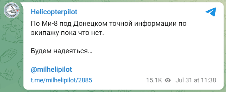 "По Ми-8 под Донецком точной информации по экипажу пока что нет. Будем надеяться...", — говорится в сообщении.