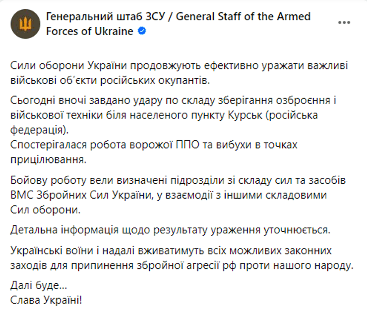 Но здесь надо обратить внимание скорее на намек о том, какое именно средство поражения могло быть использовано для удара Сил обороны Украины по базе армии РФ возле Курска.