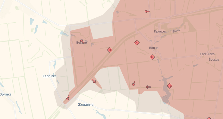 Согласно геолокационным данным, ВС РФ продвинулись дальше в пределах Веселого в направлении дороги T0511. Российские военные блогеры утверждают, что оккупанты атакуют к югу от Веселого вдоль железнодорожной линии и лесополос в направлении Сергеевки и Желанного. Это может способствовать тактическому окружению украинских сил в этом районе.