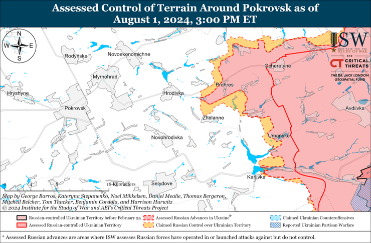 Американские аналитики считают, что нынешние темпы тактического продвижения России к Покровску, вероятно, не продлятся долго, поскольку российские войска приближаются к линии больших и более урбанизированных поселений. Следующая оборонительная линия пролегает между городами Селидово, Новогродовка и Гродовка. Текущие российские наступления сосредоточены именно на участке Новогродовка-Гродовка.