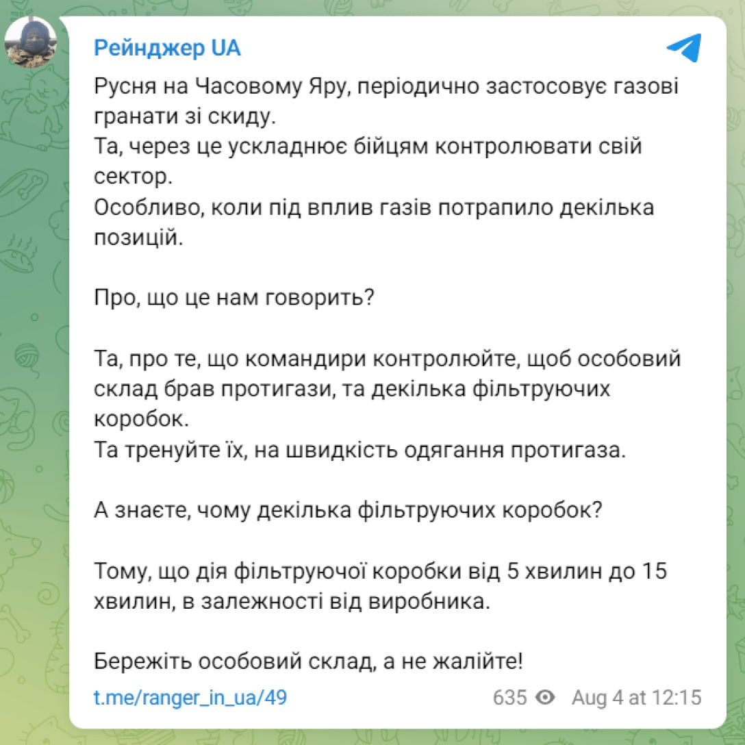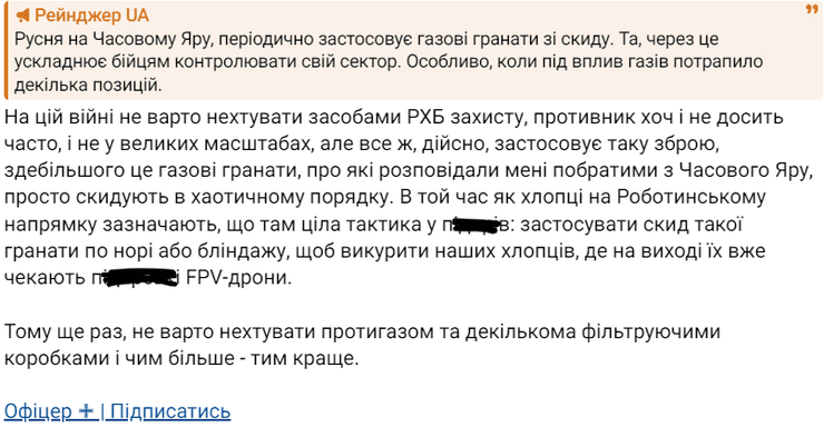 Пехотинец с ником "Рейнджер UA" в своем Telegram сообщил, что газовые гранаты россиян используют в направлении Часового Яра Донецкой области. Это затрудняет бойцам возможность контролировать свой сектор. Особенно, когда под воздействие газов попадает несколько позиций.