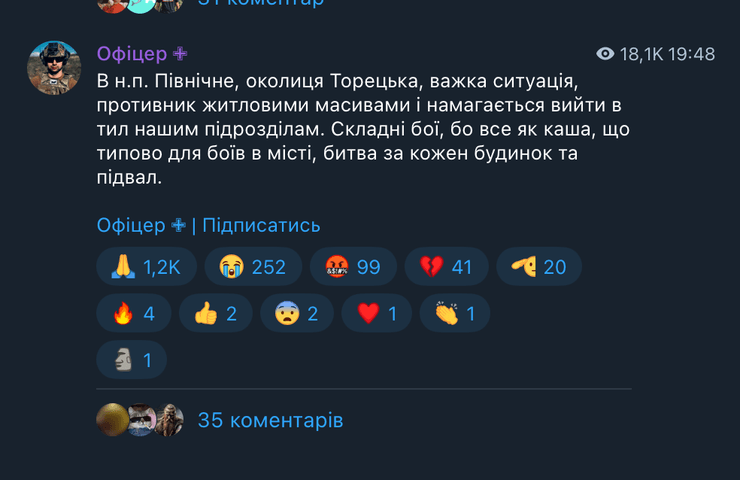 "В н.п. Северное, окраина Торецка, тяжелая ситуация, противник жилыми массивами и пытается выйти в тыл нашим подразделениям", — сказал офицер ВСУ "Алекс".