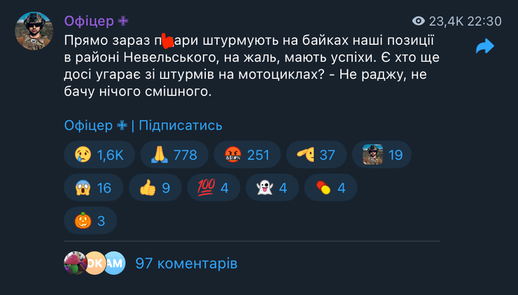 "Есть кто еще до сих пор угарает со штурмов на мотоциклах — не советую, не вижу ничего смешного", — добавил он.