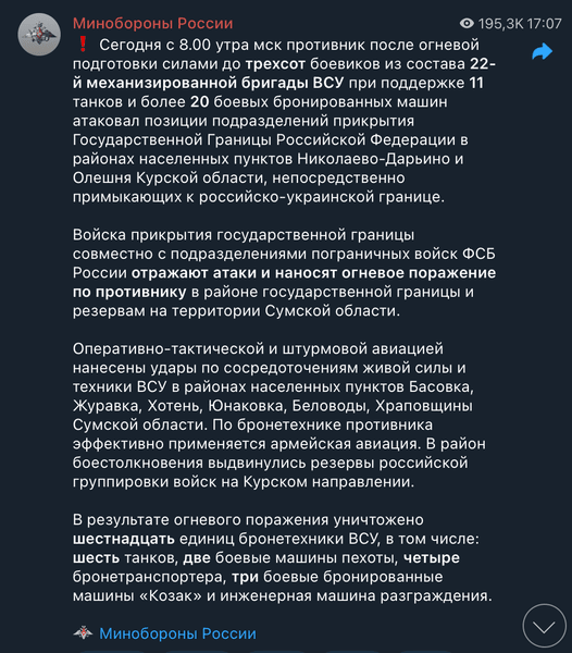 "Сегодня с 8:00 утра мск противник после огневой подготовки силами до трехсот боевиков из состава 22-й механизированной бригады ВСУ при поддержке 11 танков и более 20 боевых бронированных машин атаковал позиции подразделений прикрытия Государственной границы Российской Федерации в районах населенных пунктов Николаево-Дарьино и Олешня, которые непосредственно примыкают к российско-украинской границе", — говорится в сообщении.