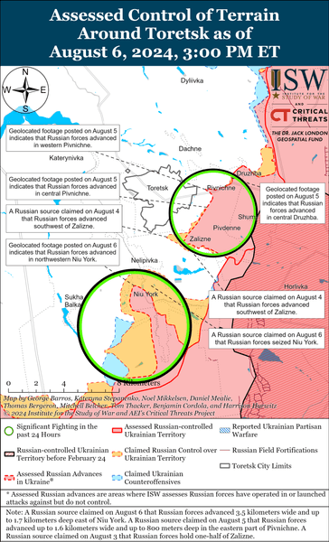 В отчете американского Института изучения войны 6 августа сообщается, что ВС РФ продвинулись вблизи Торецка, в частности, к улице Достоевского в северо-западной части Северного. Воины российской 9-й мотострелковой бригады (1-й СК "ДНР") подняли флаг над зданием на улице Гагарина в северо-западной части Нью-Йорка (к югу от Торецка).