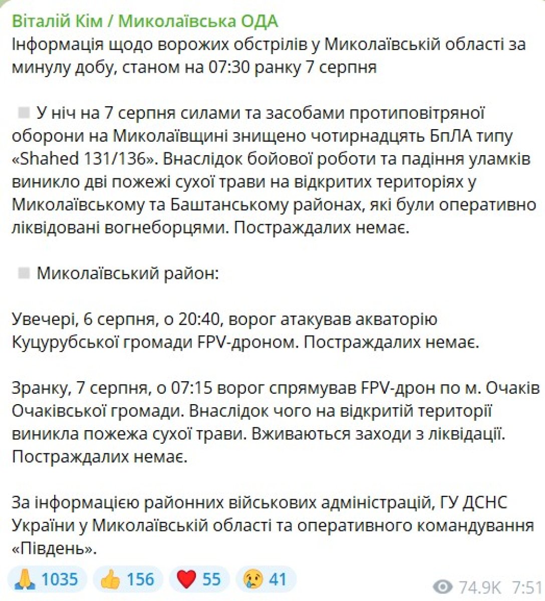 Херсонская область. Глава Херсонской ОГА Александр Прокудин не сообщал детали ночной атаки ВС РФ. В его утреннем отчете говорится об артударах и ущербе от FPV-дронов россиян.
