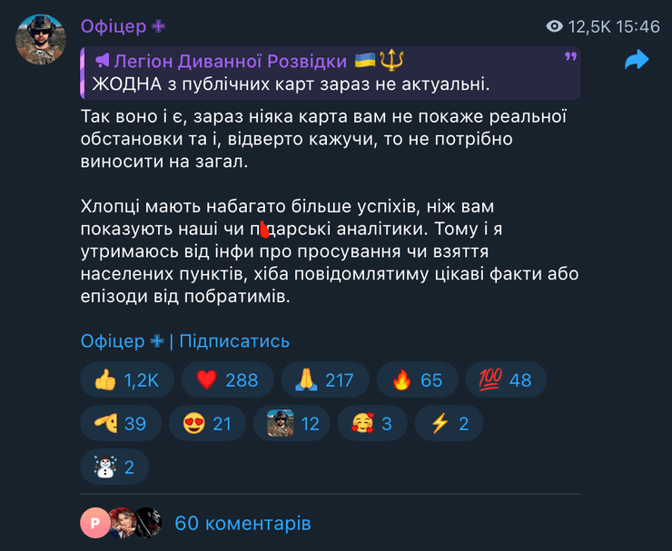 В Telegram-канале "Легион Диванной Разведки" отметили, что сейчас карты боевых действий неактуальны.