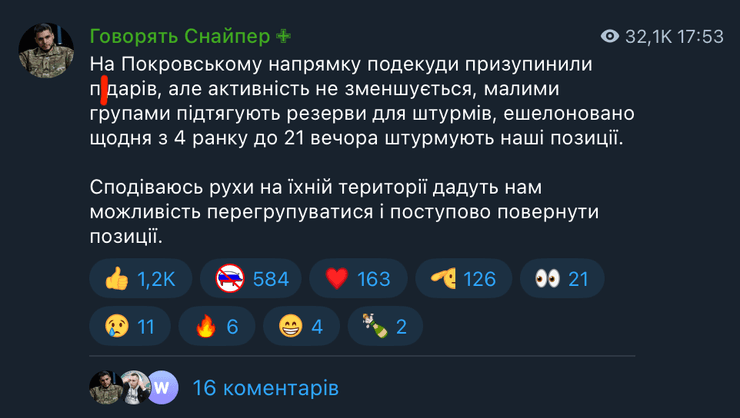 Силам обороны удалось кое-где приостановить российских военных на Покровском направлении Донецкой области. По словам украинского военнослужащего Станислава Бунятова с позывным "Осман", активность противника не уменьшается. Об этом он сообщил в своем Telegram-канале.