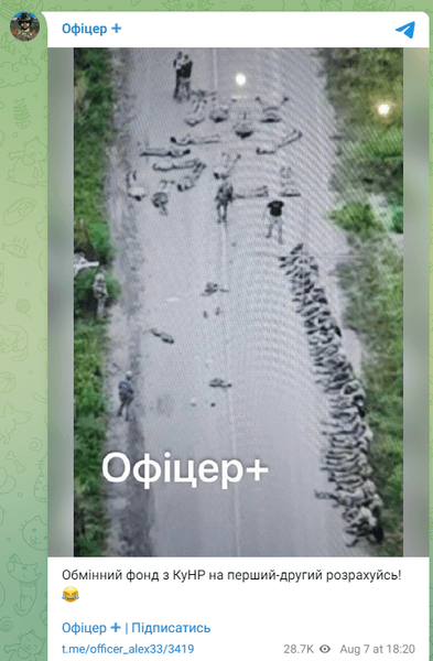 Лейтенант ВСУ с позывным "Алекс" в своем Telegram-канале "Офицер+" также разместил похожее фото, подписав его словами "Обменный фонд с КуНР (Курская народная республика — ред.) на первый-второй рассчитайся!".