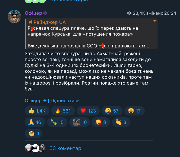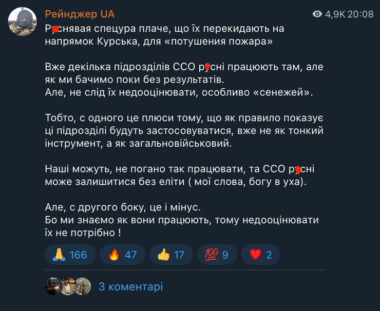 "Р*снявая спецура плачет, что их перебрасывают на направление Курска, для "потушения пожара". Уже несколько подразделений ССО р*сни работают там, но как мы видим пока без результатов. Но, не следует их недооценивать, особенно "сенежей", — сказал боец.