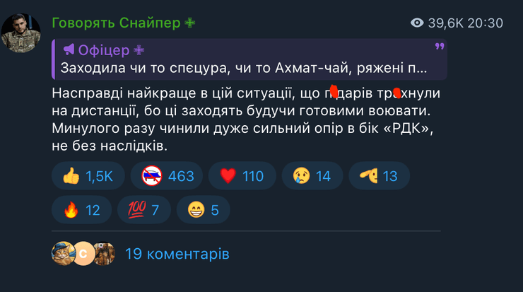 "Наши могут, не плохо так работать, но ССО р*сни может остаться без элиты (мои слова, богу в уши). Но, с другой стороны, это и минус. Потому что мы знаем как они работают, поэтому недооценивать их не нужно", — добавил он.