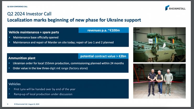 "Мы никогда не видели такого роста. Мы ожидаем, что годовой рост продаж составит около 2 млрд евро в ближайшие годы", — цитируют в отчете гендиректора Rheinmetall Армина Паппергера, который отметил, что во втором квартале продажи компании выросли ориентировочно на 50%.