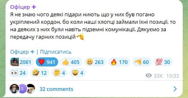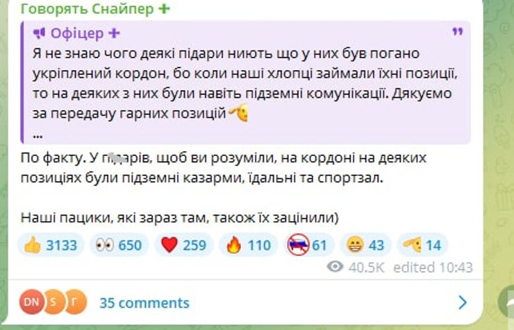 "Не знаю чего некоторые п**ары ноют что у них была плохо укреплена граница, потому что когда наши ребята занимали их позиции, то на некоторых из них были даже подземные коммуникации. Спасибо за передачу хороших позиций", — написал он.