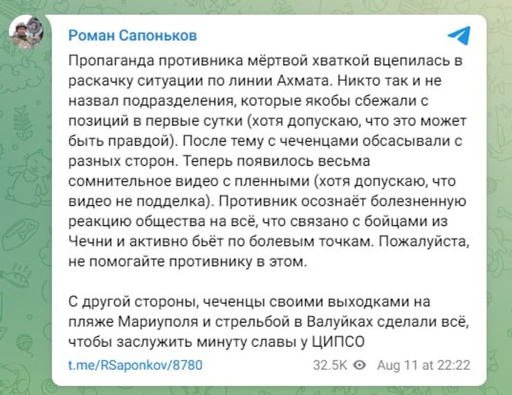 Аналитики отреагировали на сообщение российского военкора Романа Сапонькова, который возмутился, что "кадыровцев" захейтили в сети из-за побега с позиций.