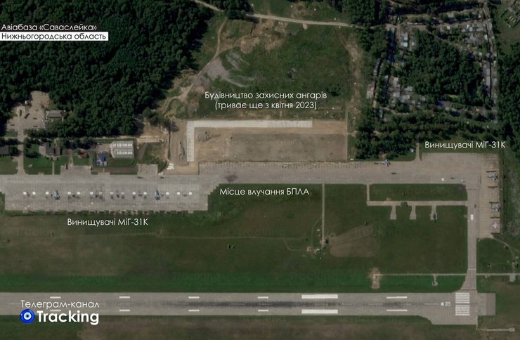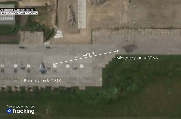По информации аналитиков канала, 1 БПЛА упал вблизи стоянки истребителей МиГ-31К в 165 м от самого самолета.